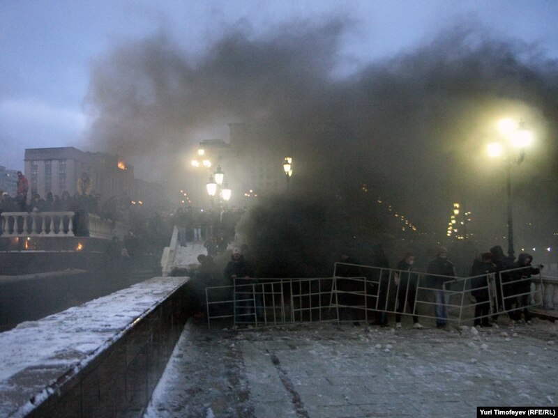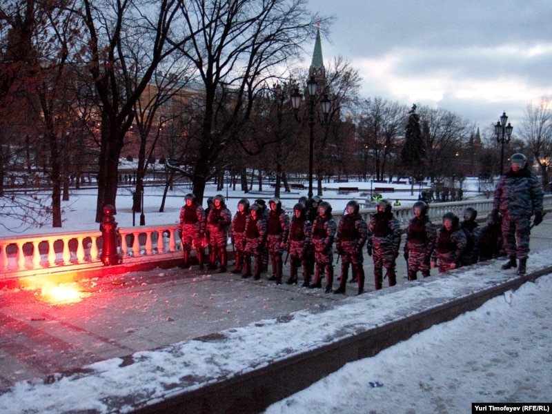 Общее же число футбольных фанатов в центре Москвы – около 3000 человек. Они разгромили огромную новогоднюю елку, установленную на площади и стали забрасывать сорванными с нее игрушками омоновцев. Время от времени в воздух взлетает ракеты, слышны взрывы, по всей видимости, от петард. Все вокруг оцеплено милицией, общее число стражей порядка около 500. По громкоговорителю они призывают собравшихся не поддаваться на провокации и обещают, что зачинщики погромов понесут наказание. ОМОН выдавливает фанатов в сторону метро, в ответ в них летят ледышки и петарды.